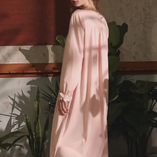 The fabric drapes in the loveliest way, light yet modest, with lace-trimmed details at the hem and cuffs that whisper of vintage heirlooms passed down with love. Whether you’re padding softly through the house at dawn or settling into bed with a good book, this gown wraps you in calm, cottage sweetness.